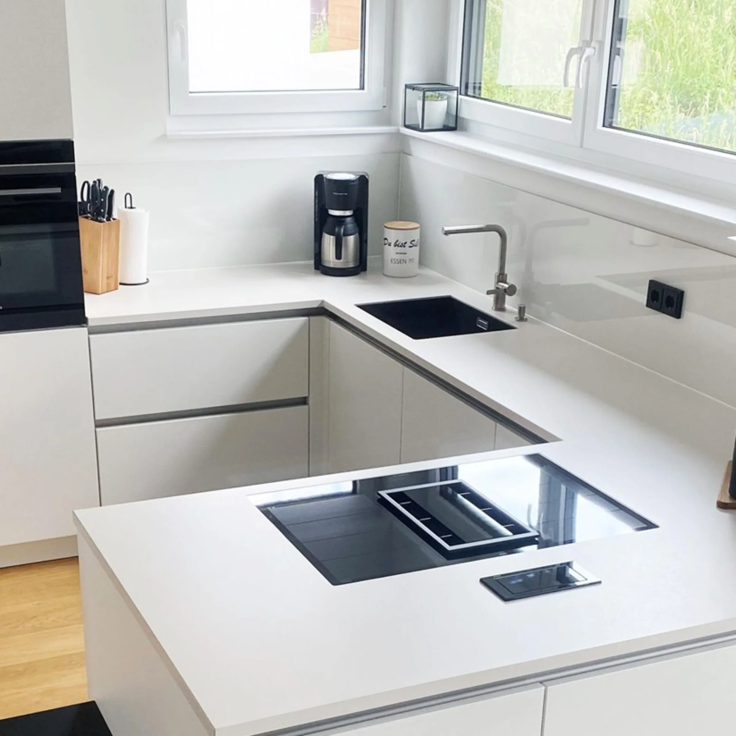 Ja genau. Die lange Küchenzeile und die Kücheninsel bieten uns viel Arbeitsfläche. Diese haben wir sogar noch erweitert indem wir uns für eine Übertiefe Arbeitsplatte von 75 cm entschieden haben. Der Platz zum Arbeiten war uns sehr wichtig, damit man sich sowohl im Alltag beim Kochen nicht im Weg ist, als auch mit Freunden ausreichend Platz hat.