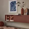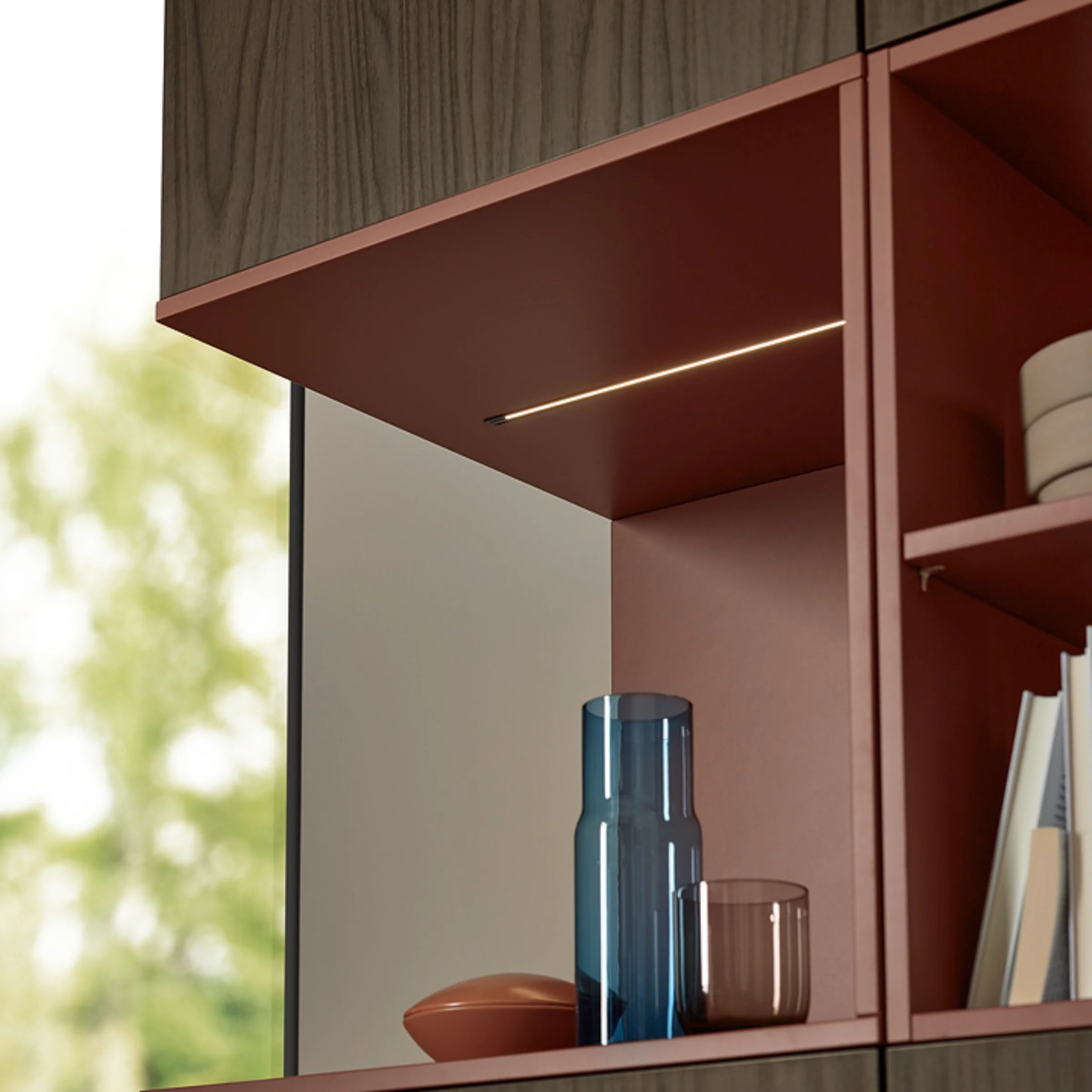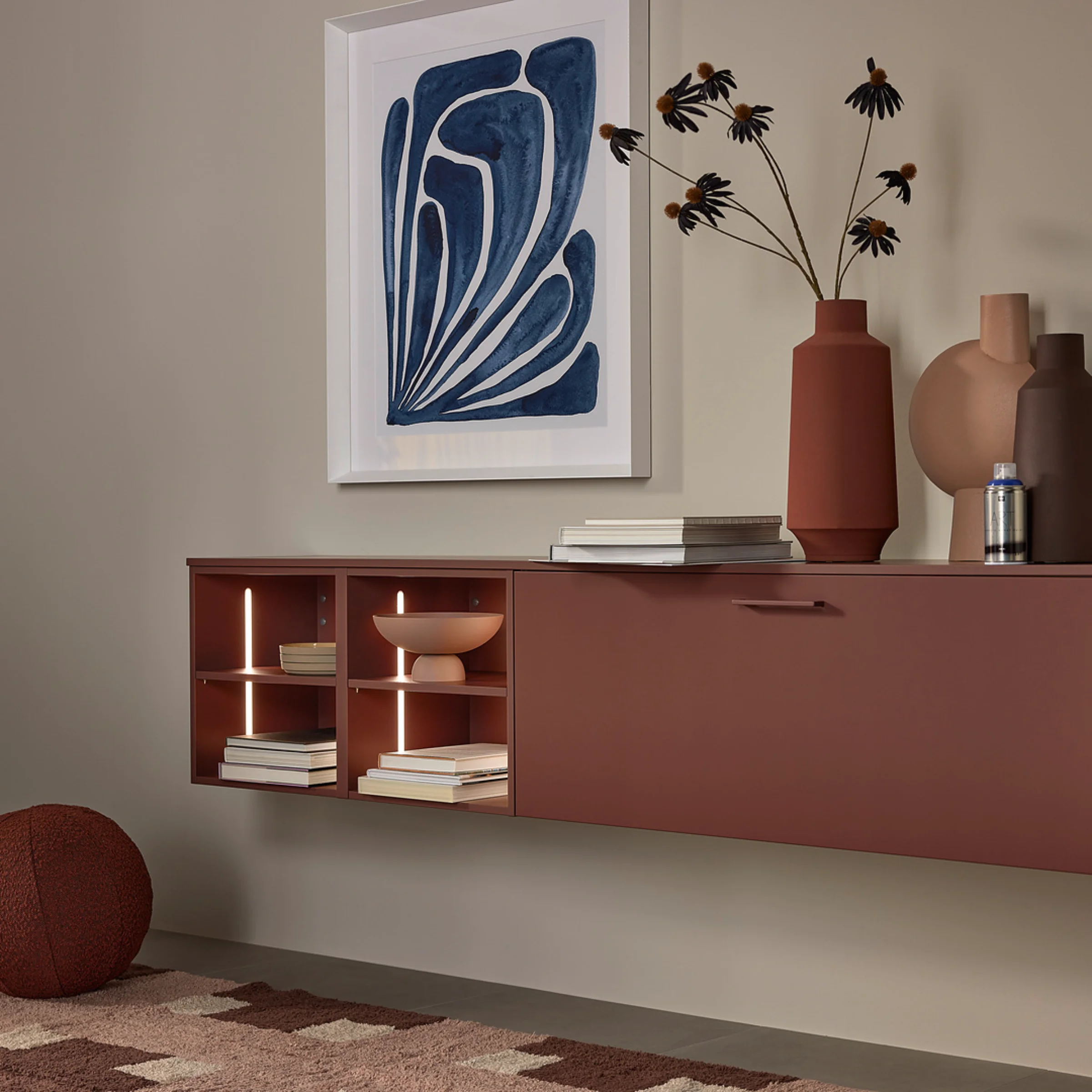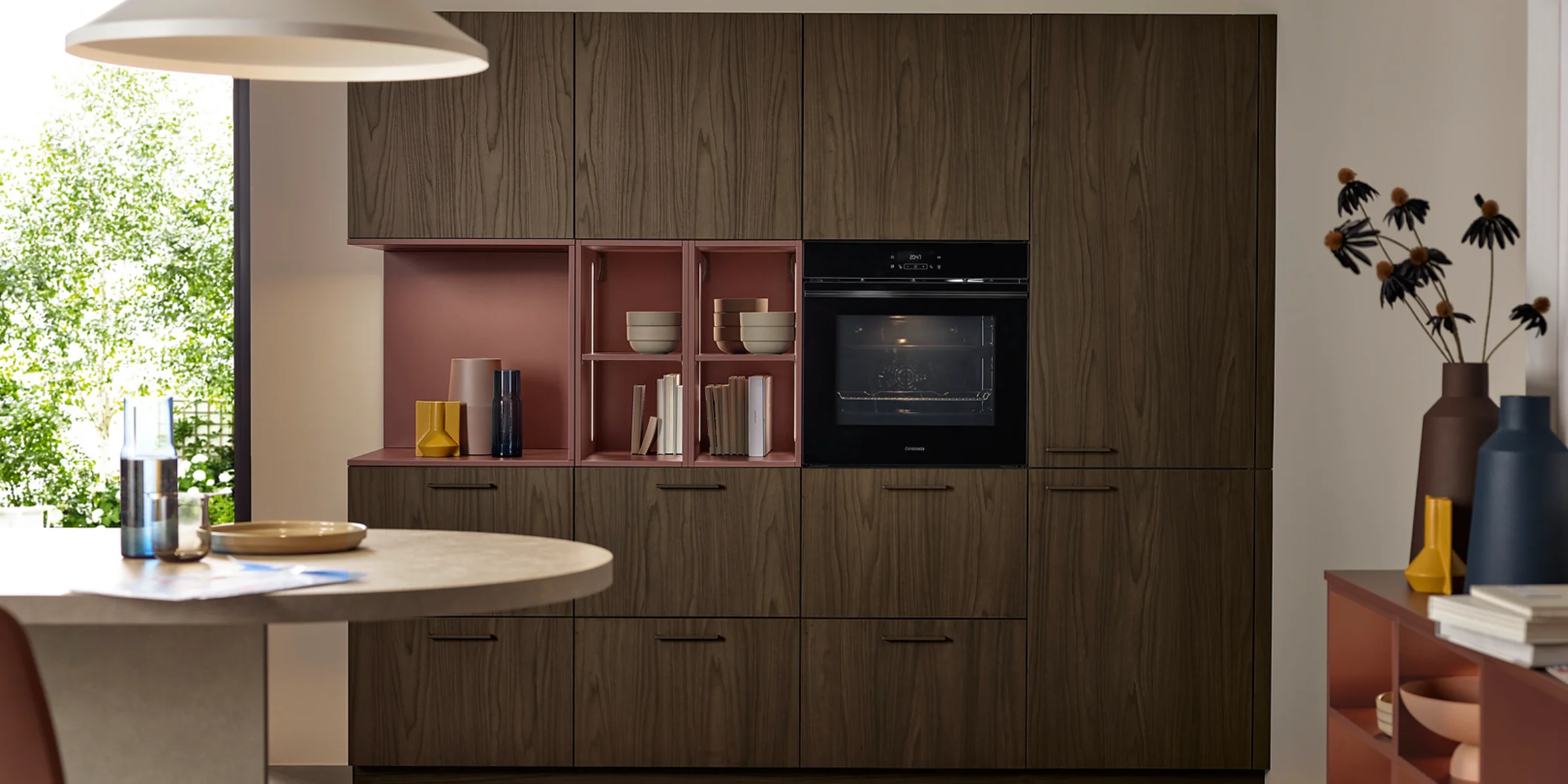 This kitchen design combines bold colors with natural materials to create a modern, inviting overall look. Wall cabinets and a sideboard in SOFT LACK Hennarot add striking accents and give the kitchen a warm, distinctive character.