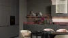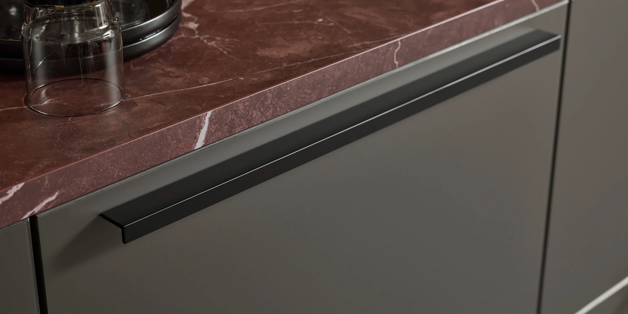 In the Umbra Metallic color, the front makes a striking statement and is complemented by the expressive Red Marble countertop finish. The distinctive stone look with its intense red tones creates bold accents and is harmoniously reflected in the niche and shelving elements.