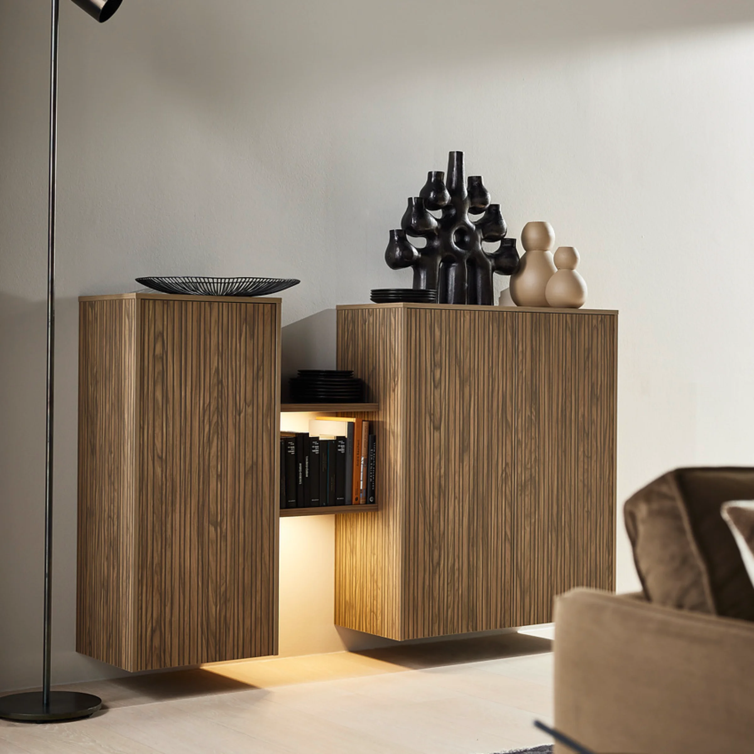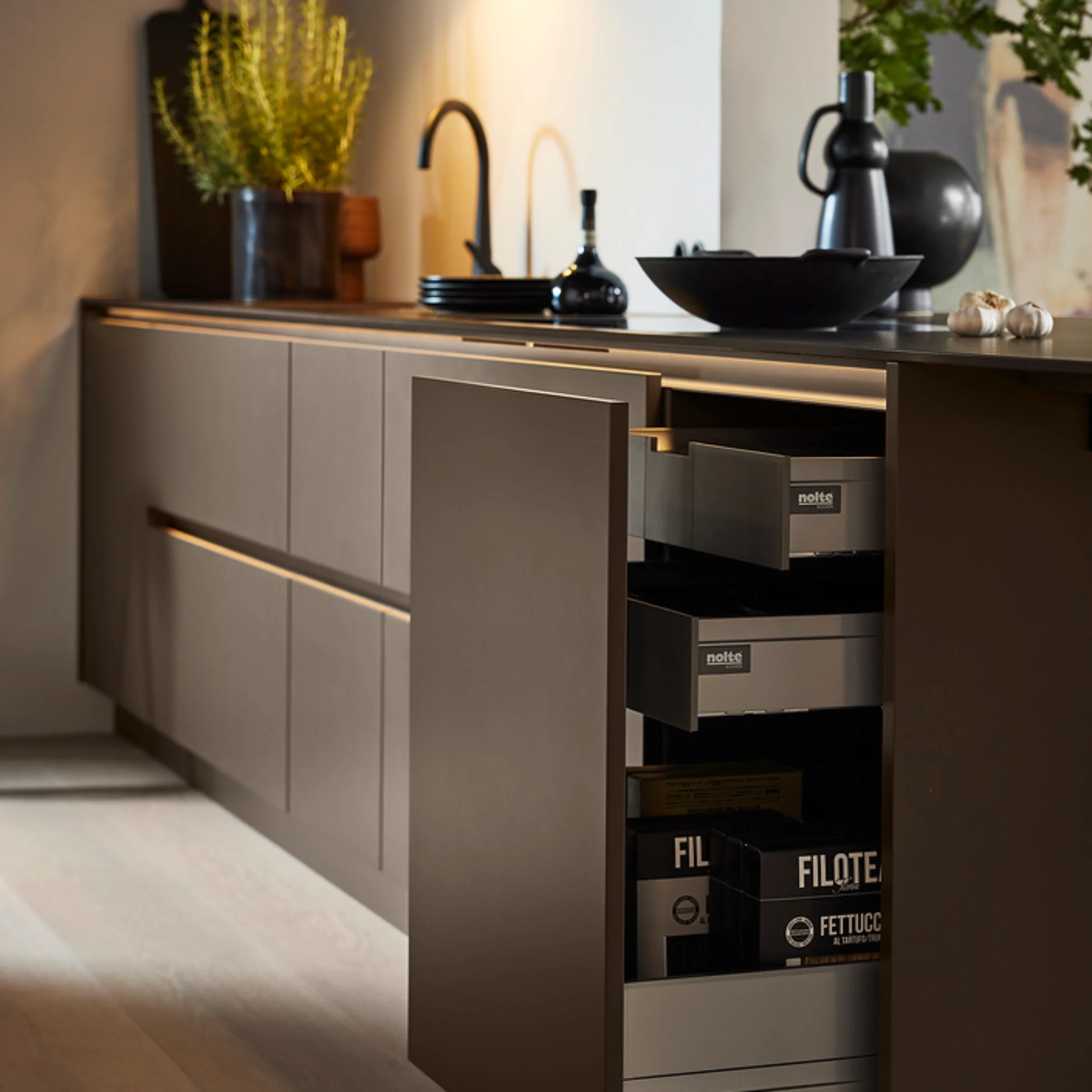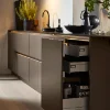 Los armarios altos y el aparador retoman la estructura especial de los frentes y la realzan con elegancia. Como contrapunto sereno, la isla de cocina en SOFT LACK marrón sepia mate suave completa el concepto. Su superficie aterciopelada proporciona un equilibrio armonioso entre la llamativa estructura de madera y la claridad moderna.