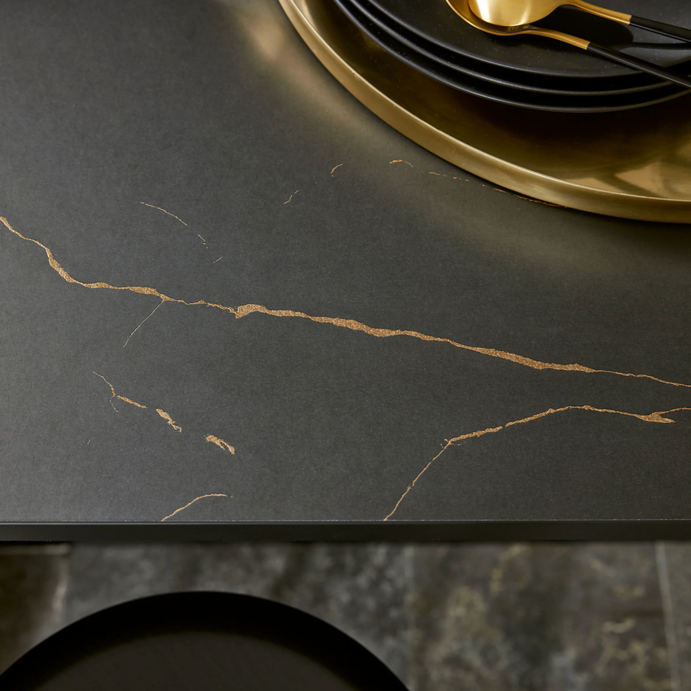 Le rebord périphérique aspect laiton constitue un élément de design particulier qui confère à la cuisine une touche élégante et haut de gamme. Les accents métalliques chaleureux reprennent les fines lignes dorées du plan de travail et de la crédence dans le décor Black Mangor et assurent une interaction harmonieuse entre les surfaces sombres et les détails raffinés.