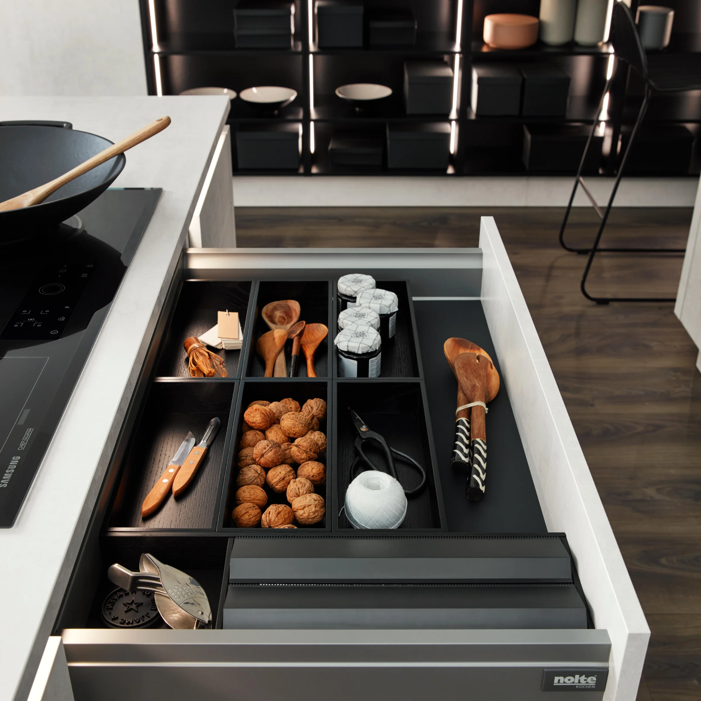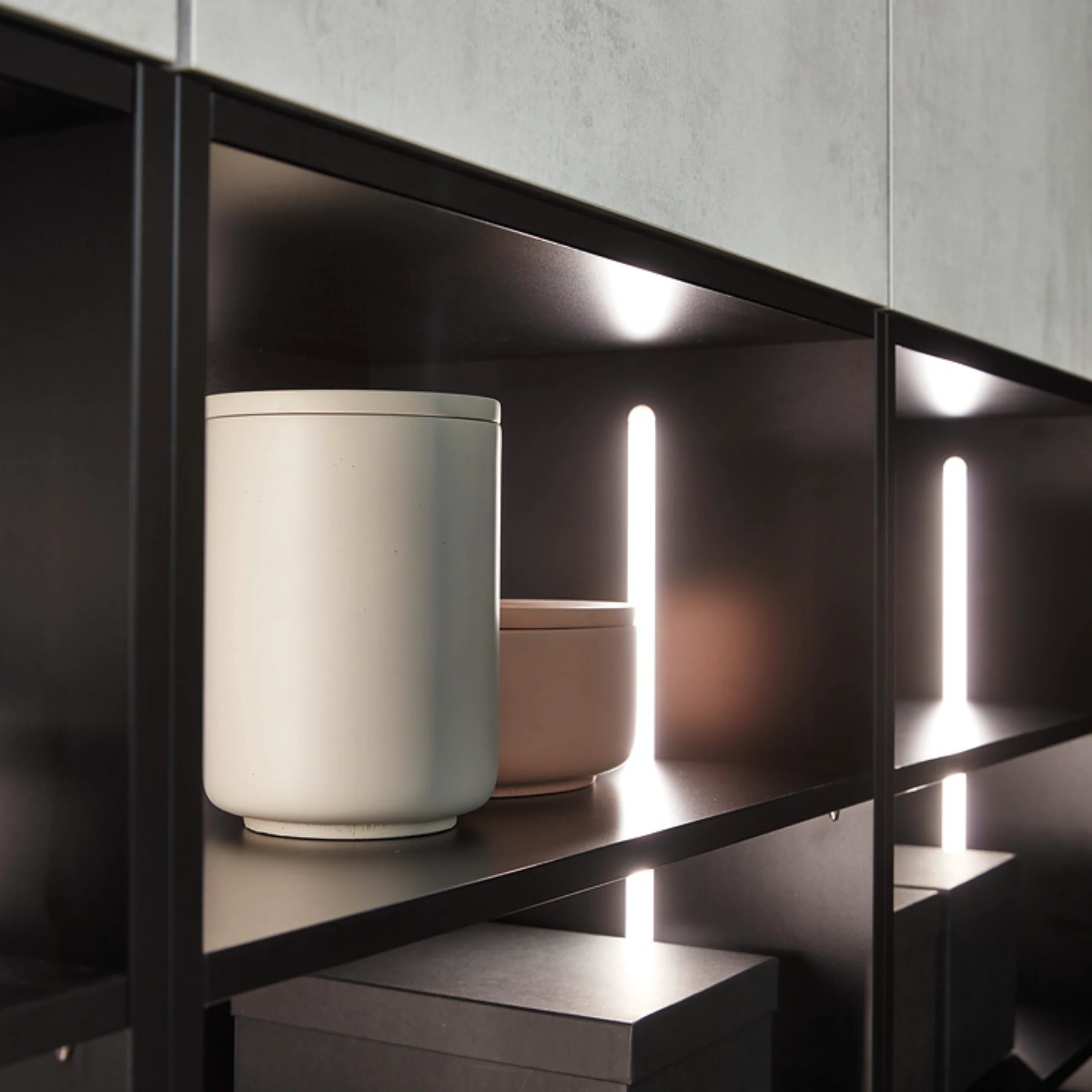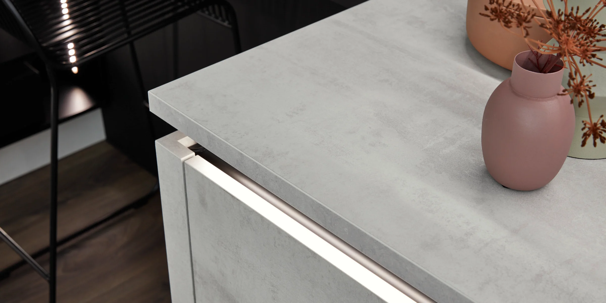Un altro punto di forza sono le guide di presa illuminate e i ripiani aperti, che creano discreti accenti di luce e conferiscono alla cucina un’atmosfera aggiuntiva. In questo modo, questa moderna cucina senza maniglie dall’effetto cemento coniuga design minimalista, progettazione funzionale e una suggestiva illuminazione d’atmosfera.