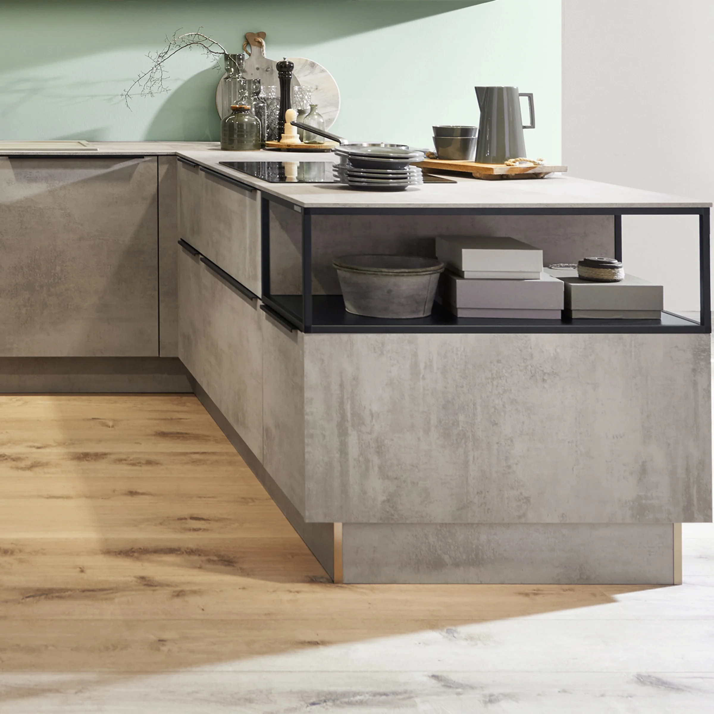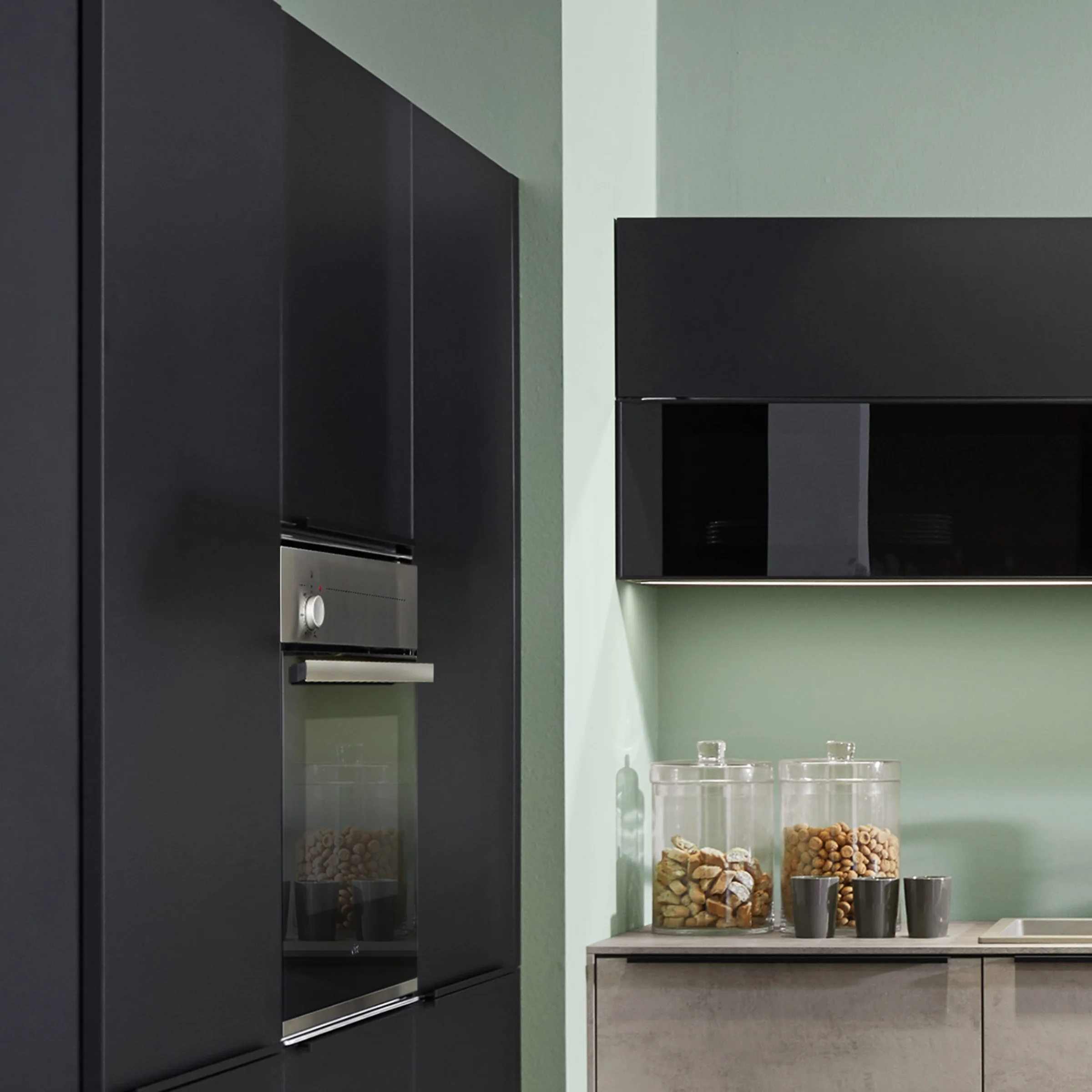 Diese schwarze Küche zeigt, wie stilvoll Purismus sein kann. Der moderne Mix aus Betonoptik und mattschwarzen Fronten bringt Design und Funktion perfekt in Einklang. Die grifflosen Fronten unterstreichen den minimalistischen Look, während das offene Regal in Schwarz für Leichtigkeit sorgt. Zusammen entsteht eine moderne Küche, die durch klare Linien, edle Materialien und eine harmonische Farbkomposition überzeugt. Wer eine elegante und pflegeleichte Küche sucht, die sich nahtlos in den Wohnraum einfügt, wird diese Planung lieben – ein echtes Statement für zeitloses Küchendesign.